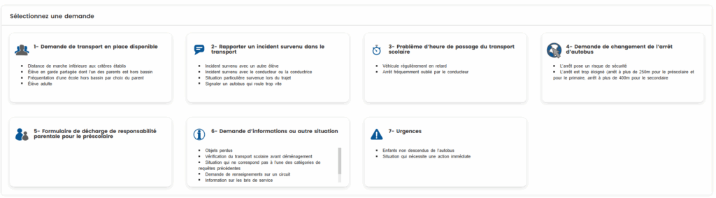 ** Nouvelles procédures : Cliquez ici accéder à la page du transport scolaire puis cliquez sur « Service de demande en ligne » puis organisation scolaire et transport.